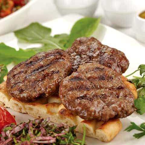 Tam porsiyon özel köftelerimiz, yanında taze doğranmış soğan ve biberlerle birlikte servis edilir.