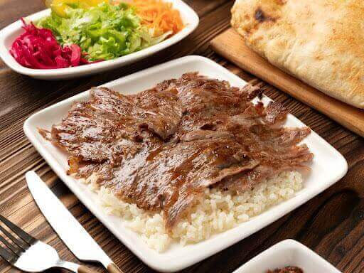 Özenle marine edilmiş ve yavaşça pişirilmiş, ince dilimlenmiş et dönerimiz, pilav üstü olarak servis edilir.
